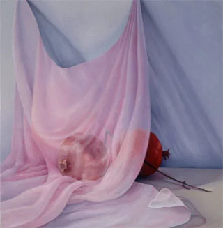 She paints a pair of full, dark pomegranates draped by a pink veil, an image that makes exquisitely palpable the lushness and fertility of the fruit, mentioned frequently in the text. She paints a "Lily Among Thistles" in a vase of diluted blood, intensifying the text's reference to the author's love as a "lily among thorns."
